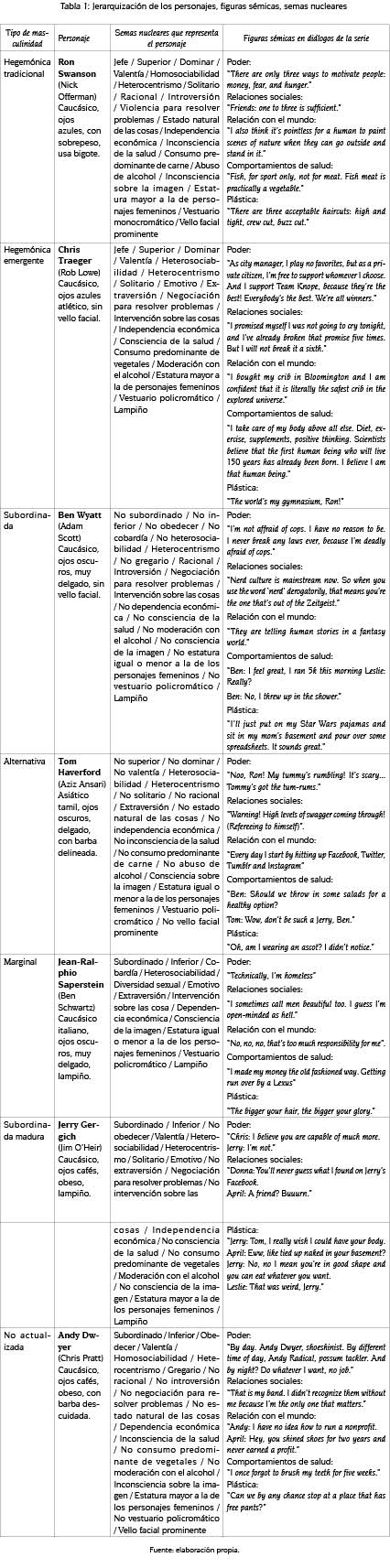 En la tabla 1 se enlistan las características de los personajes y cuatro ejemplos lingüísticos para ilustrar la representación simbólica de cada tipo de masculinidad. Los dos hombres hegemónicos tienen en común que ejercen una posición burocráticamente más alta que la protagonista y el resto de los personajes; ambos son caucásicos, de ojos azules, independientes económicamente –Ron Swanson (Nick Offerman) trabaja en el Gobierno para desestabilizarlo desde el interior siguiendo una ideología libertaria y Chris Traeger (Rob Lowe) trabaja por placer para rescatar a gobiernos municipales en crisis–, se presentan como heterosexuales y galantes con las mujeres, son solitarios y en muy pocas ocasiones son representados en ámbitos privados. Sin embargo, mientras que Ron encarna a la masculinidad tradicional–.