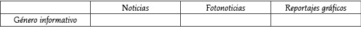 Dentro del género informativo distinguimos: noticias, fotonoticias, y reportajes gráficos.