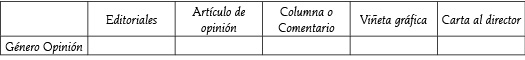 Asimismo, forman parte del género opinión: editoriales, artículos de opinión, columna o comentario, viñeta gráfica, y carta al director.