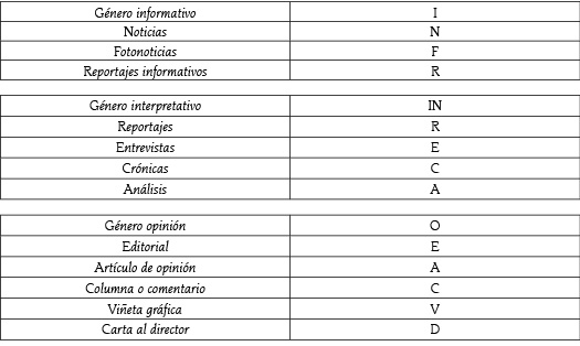 En primera instancia, todas las informaciones las hemos sometido a una distinción sobre a qué género periodístico pertenecen: género informativo, género interpretativo y opinión, de acuerdo con la definición que para cada uno de estos términos hace Grijelmo (1997).