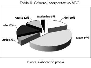 El género interpretativo se empleó con un 44% (64 unidades) en el mes de mayo; le siguen: abril, con un 19% (28); julio, con un 17% (25); agosto, con un 12% (17); junio, con un 5% (8), y septiembre, con un 3% (5).