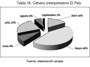 El género interpretativo fue empleado por El País con mayor incidencia en el mes de mayo con un 44% (68 unidades); le siguen: julio, con un 23% (36); abril, con un 16% (25); junio, con un 8% (12); agosto con un 6% (10), y septiembre, con un 2% (3).