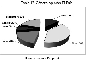El País empleó el género opinión: con mayor incidencia en un 40% (6 unidades) en el mes de mayo; le siguen junio y septiembre, con un 20% (3), respectivamente; abril, con un 13% (2); julio, con un 7% (1), y agosto con un 0%.