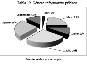 El género informativo se empleó con mayor incidencia durante los meses de julio y agosto con un 26% y (27 unidades); mayo con un 23% (24); septiembre, con un 13% (13); junio, un 10% (10), y abril, con un 2% (2).