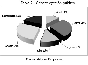 El género opinión se empleó en un 43% (6 unidades) en el mes de mayo; en un 21% (3), en julio; con un 14% (y 2 unidades), respectivamente, los meses de abril y agosto; con un 7% (1) tenemos el mes de septiembre, y con 0% el mes de junio.
