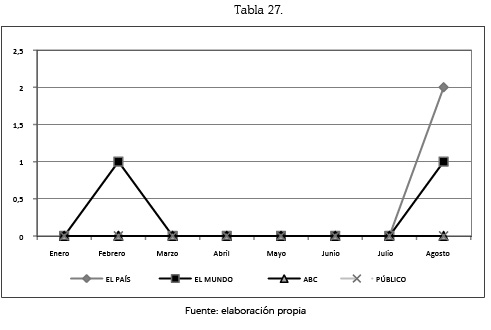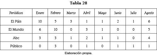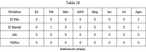 De entre los 6 meses seleccionados nos hemos encontrado con un total de 1.036 unidades de análisis que se corresponden a las informaciones aparecidas en El País, ABC, El Mundo y Público y a las que hemos realizado dos tipos de análisis de contenido.