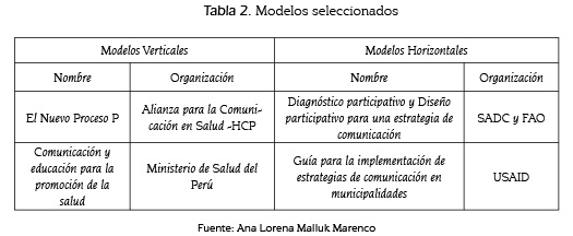 De igual forma, se escogieron cuatro modelos de planeación del programa de comunicación estratégica planteados por organizaciones como la Alianza para la Comunicación en Salud, la FAO, la USAID y el Ministerio de Salud del Perú, como marco de referencia para determinar la coherencia del diseño y gestión del programa de comunicación estratégica.