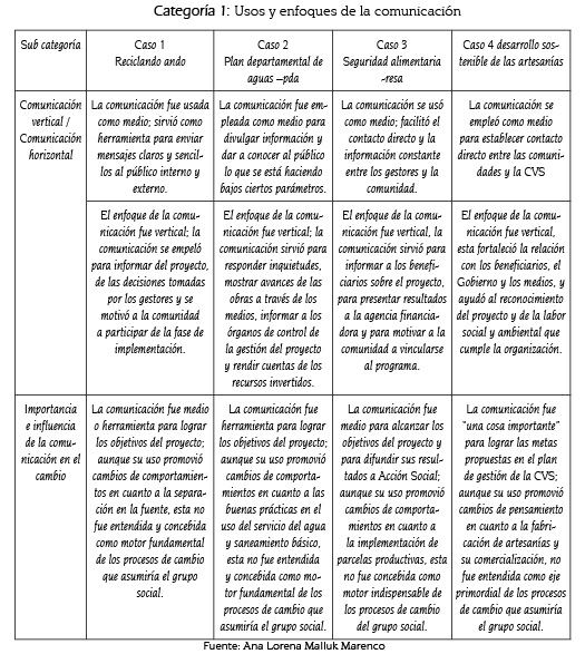 Four programs of project strategic communication were analyzed: ''We are Recycling, State Water Plans, Implementation of Productive Areas, and sustainable Development of Cordoba handcrafts, developed by the following organizations: Servigenerales/UPB, Gobernación Córdoba, Fundación Santa Isabel, and Corporación de los Valles del Sinú and San Jorge, respectively. An individual analysis of each case was carried out. It included different contact strategies with the study object such as documental analysis, the interview, focal group, and participant observation which allowed feeding –methodologically- theoretical documentation, interpretation of evidences, and the interaction of the researcher with agents and their realities.