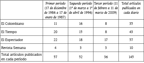 Ante lo extenso que puede significar el estudio de los discursos sobre drogas, se seleccionaron tres períodos coyunturales, de tres décadas diferentes, durante los cuales se presentaron hechos relevantes relacionados con dicha problemática y que dieron lugar a un gran despliegue mediático. Se incluyeron todos los artículos que hicieran alusión directa a las drogas ilegales (tráfico, traficantes, consumo, políticas, etc.), desde el momento en que se produjo el hecho que desató el despliegue hasta un mes después. Los períodos fueron: