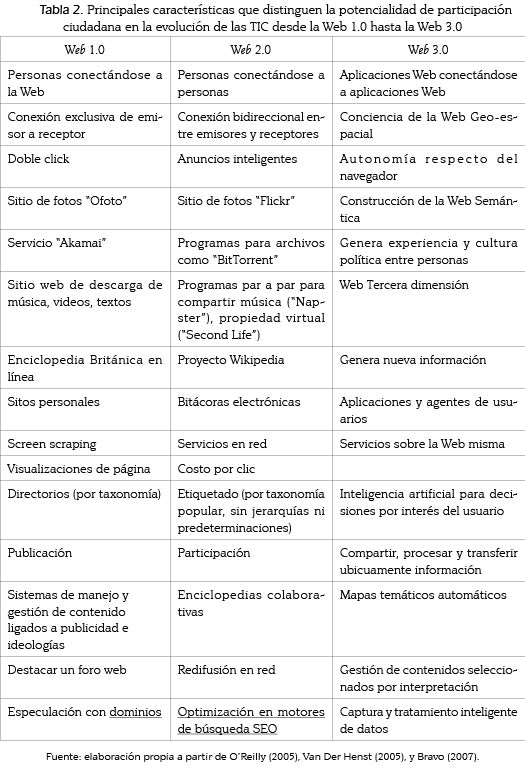 El alcance de la Web en la participación ciudadana, como el camino de la periferia al centro y en la perspectiva de su influencia en el Estado, puede ilustrarse con los avances en materia de condición comunicativa, creación cultural e influencia política entre los mass media tradicionales, los new media y de la Web 1.0 a la Web 3.0. En el listado de los medios tradicionales se encuentran los diarios o periódicos, la radio, el cine y la televisión. En los new media, o tecnología de información y comunicación denominada también Web 2.0 –para distinguirla de la simple Internet o Web 1.0 donde solo cabía la relación unilateral emisor - receptor–, se hallan: el correo electrónico, el teléfono móvil con inclusión de Internet, los portales interactivos de Chats, foros, Blogs; el Facebook, el Twitter, las cuentas de You Tube, los Wikis, como particularmente los Wiki - leaks y la Wiki - pedia de colaboración abierta, las cuentas de Mp3, y el P2P (Peer to peer o red de pares que se constituye sin clientes ni servidores), por mencionar solo los sitios o redes no comerciales y de mayor vigencia, pues paralelamente a estos se existen las redes comerciales como Flickr, Tuenti, MySpace y un larguísimo etcétera. Toda esta tecnología (new media) podemos enfocarla a diversos tipos de incidencia digital en los portales electrónicos donde, a diferencia de los medios tradicionales, los usuarios pueden ser a la vez receptores y emisores, gracias a lo cual la participación ciudadana rebasa los límites de los mass media tradicionales y de la tradicional representatividad política. Las diferencias entre mass media y new media al respecto podemos visualizarlas en la siguiente tabla.