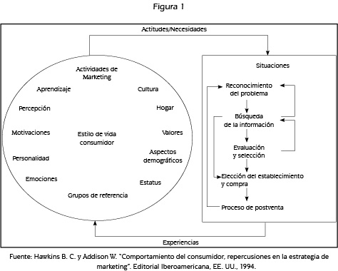 A partir de la comprensión del consumidor se busca fortalecer la creación de estrategias de marketing y detectar y/o satisfacer necesidades en un mercado. Es importante, entonces, reconocer que las estrategias de mercadeo nacen de un conocimiento previo de las necesidades del consumidor y su entorno (cultura); Ello implica entender y comprender aspectos tales como motivaciones, percepciones y actitudes del consumidor. Hawkins (1994) plantea un modelo general del comportamiento del consumidor (como se muestra en la figura siguiente) donde se aprecian estos factores que influyen en la conducta del consumidor: