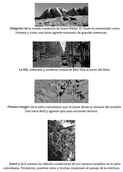 La película embarca al espectador en un viaje de contrastes y aventuras por tres lugares radicalmente distintos. El filme inicia con una de las escenas de la última novela escrita por Joane. Luego de mostrar el árido y salvaje Oeste, el filme nos muestra la vida tranquila y solitaria de la escritora en la cosmopolita ciudad de New York. De la capital del mundo, el filme nos transporta a la selvática y caótica Colombia, donde Joane enfrentará sus miedos y encontrará el amor. New York, organizado y seguro, se nos muestra como el sitio ideal para vivir. El desierto del viejo Oeste donde dominan los criminales se nos compara metafóricamente con la vasta selva colombiana, en donde también impera le ley del más fuerte4. Una aproximación a la narrativa, el tratamiento de los personajes y a los paisajes de este filme nos mostrará el claro contraste que se hace entre un mundo moderno y un mundo de barbarie, en donde Colombia se escenifica como una exótica república de los trópicos, reducida al estereotipo de lo primitivo.