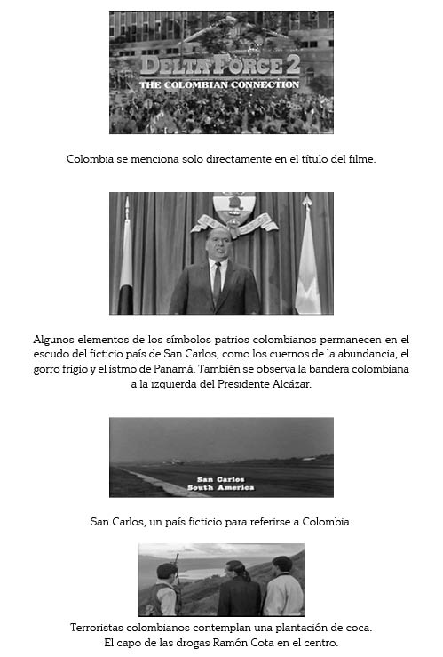 8 Quizá esto se deba a razones de producción, pues el filme inicialmente se llamaría Delta Force II: Operation Stranglehold, aunque quizá haya otras razones de peso para obviar y no especificar el nombre de Colombia.