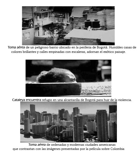Por estas razones, encontramos diversas películas que muestran a Colombia con una fauna de llamas, alpacas y otros camélidos, ambientes de selvas profundas, terrible clima tropical de altas temperaturas18, de lluvias torrenciales y habitantes indígenas o campesinos mestizos. Los mismos clichés se utilizan para casi todos los países latinoamericanos, desde México hasta Tierra del Fuego, la única diferencia palpable radica en el epígrafe que aparece identificando la ciudad o el país. Un espectador desavisado que tenga como único referente los filmes de Hollywood, podría pensar que los países latinoamericanos son muy parecidos y casi indistinguibles entre sí. Podríamos concluir que tanto para productores y cineastas, como para los espectadores norteamericanos, no importa la veracidad de lo que está siendo mostrado, lo que sí se espera es que estos epígrafes correspondan a ciudades y países reales.