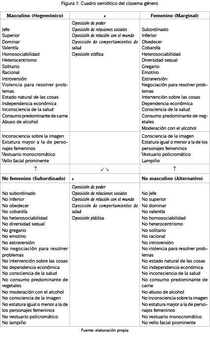 La oposición de los términos masculino y femenino produce una jerarquía encabezada por la masculinidad tradicional; por la operación de aserción el término masculino necesita de la existencia del término femenino para tener sentido. Los semas nucleares, debajo de los términos, por homologación, fueron considerados como constitutivos de la representación simbólica de la masculinidad o no masculinidad de los personajes. La masculinidad alternativa surge simbólicamente por la operación de negación y contradicción de los semas nucleares de la masculinidad hegemónica; sus semas no corresponden directamente con los precedentes de la feminidad, pero sí los implican. En cambio, la masculinidad subordinada aparece como consecuencia de la implicación de la masculinidad, pues sus semas nucleares contradicen a los de feminidad (figura 1).
