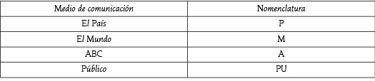 Para cada unidad de análisis hemos asignado una nomenclatura alfa-numérica que se corresponde con el tipo de medio, el número de orden de la unidad de análisis por orden numérico, el género periodístico al que corresponde, el tipo de información, la fecha a la que corresponde en formato (día, mes, y año) con dos dígitos, y una letra en orden alfabético en el caso de que apareciera más de una información en un mismo día, a modo de diferenciarlas por el orden de publicación en el medio, es decir, (A,B,C,...).
