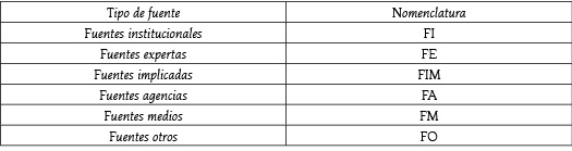 Para cada unidad de análisis, hemos elaborado un cuadro que cuenta con la nomenclatura aportada por el primer análisis de contenido, y el número de fuentes empleadas. A continuación, mostramos una de estas fichas: