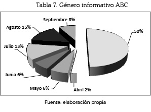 El género informativo en ABC se empleó durante el mes de agosto con un 15% (46 unidades); le sigue julio, con un 13% (42); septiembre, con un 8% (26); mayo, con un 6% (20); junio, con un 6% (18), y abril, con un 2% (6).