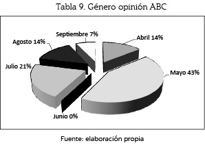 El género opinión se empleó en un 43% (6 unidades) en el mes de mayo; en un 21% (3), en julio; con un 14% (y 2 unidades), respectivamente, los meses de abril y agosto; con un 7% (1) tenemos el mes de septiembre, y con 0% el mes de junio.