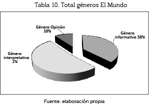 El género periodístico más utilizado por El Mundo fue el informativo con un 50% (158 unidades); el género interpretativo con un 46% (147), y el género opinión con un 14% (14).