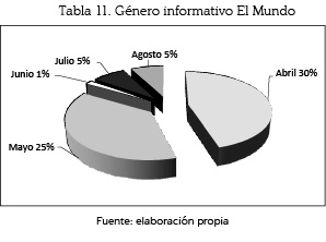 El género informativo se empleó en el periódico el Mundo en un 35% (38 unidades) en el mes de julio; en un 32%, en el mes de agosto con (32 unidades); le sigue el mes de septiembre, con un 25% (27); con un 5% respectivamente, (y 5 unidades) en los meses de mayo y junio, y por último, en abril, con un 1% (1).