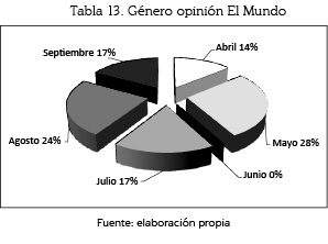 El género opinión se empleó en el periódico El Mundo con mayor intensidad en el mes de mayo en un 28% (8 unidades); le sigue el mes de agosto, con 24% (7); luego, los meses de julio y septiembre con un 17% (5) cada uno, y un 14% (4) el mes de abril.