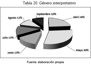 El género interpretativo se empleó con un 44% (64 unidades) en el mes de mayo; le siguen: abril, con un 19% (28); julio, con un 17% (25); agosto, con un 12% (17); junio, con un 5% (8), y septiembre, con un 3% (5).
