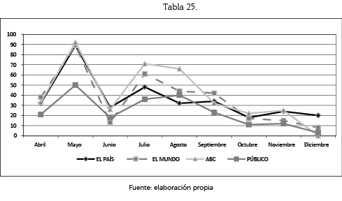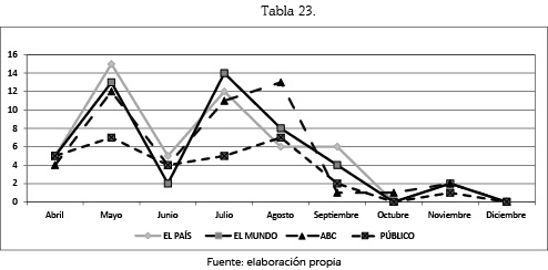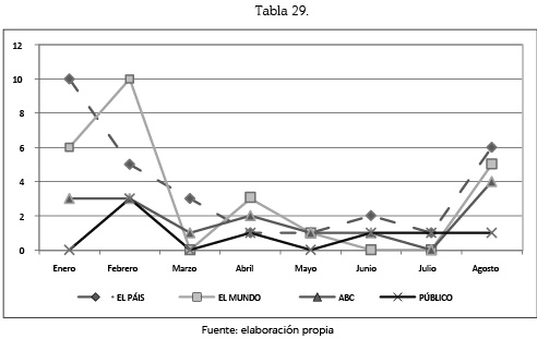 De entre los 6 meses seleccionados nos hemos encontrado con un total de 1.036 unidades de análisis que se corresponden a las informaciones aparecidas en El País, ABC, El Mundo y Público y a las que hemos realizado dos tipos de análisis de contenido.
