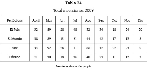 También hemos elaborado una clasificación sobre el género periodístico empleado para la difusión de estas informaciones, y un análisis del total de inserciones por parte de los citados medios durante el total del transcurso de los 17 meses de crisis (abril de 2009-agosto 2010) para poder observar el desarrollo informativo que tuvo este caso en los citados medios de prensa escrita nacional.