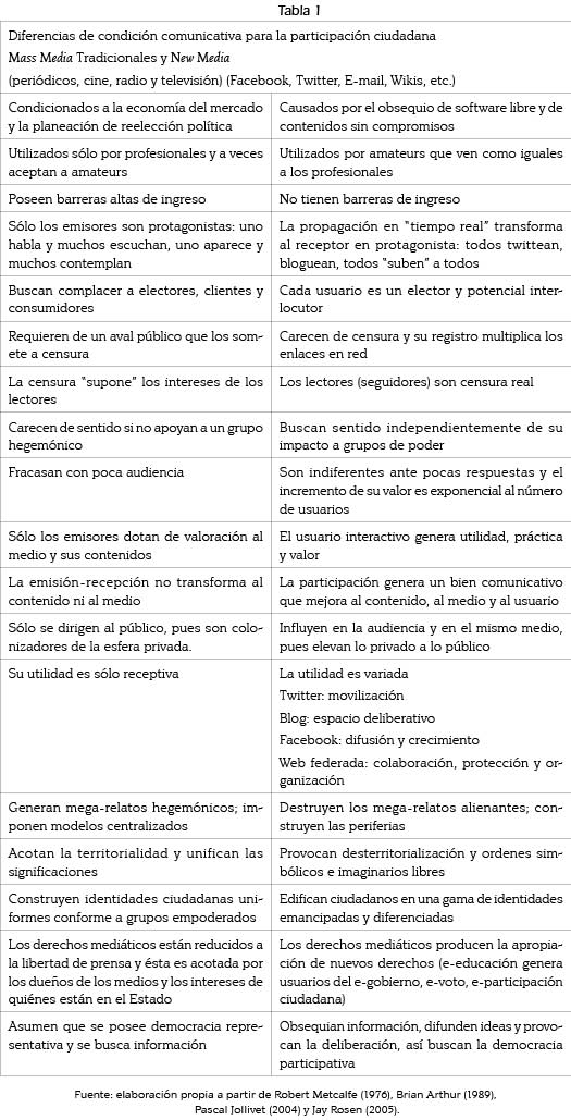 El alcance de la Web en la participación ciudadana, como el camino de la periferia al centro y en la perspectiva de su influencia en el Estado, puede ilustrarse con los avances en materia de condición comunicativa, creación cultural e influencia política entre los mass media tradicionales, los new media y de la Web 1.0 a la Web 3.0. En el listado de los medios tradicionales se encuentran los diarios o periódicos, la radio, el cine y la televisión. En los new media, o tecnología de información y comunicación denominada también Web 2.0 –para distinguirla de la simple Internet o Web 1.0 donde solo cabía la relación unilateral emisor - receptor–, se hallan: el correo electrónico, el teléfono móvil con inclusión de Internet, los portales interactivos de Chats, foros, Blogs; el Facebook, el Twitter, las cuentas de You Tube, los Wikis, como particularmente los Wiki - leaks y la Wiki - pedia de colaboración abierta, las cuentas de Mp3, y el P2P (Peer to peer o red de pares que se constituye sin clientes ni servidores), por mencionar solo los sitios o redes no comerciales y de mayor vigencia, pues paralelamente a estos se existen las redes comerciales como Flickr, Tuenti, MySpace y un larguísimo etcétera. Toda esta tecnología (new media) podemos enfocarla a diversos tipos de incidencia digital en los portales electrónicos donde, a diferencia de los medios tradicionales, los usuarios pueden ser a la vez receptores y emisores, gracias a lo cual la participación ciudadana rebasa los límites de los mass media tradicionales y de la tradicional representatividad política. Las diferencias entre mass media y new media al respecto podemos visualizarlas en la siguiente tabla.