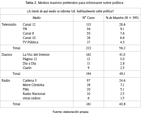 Particularmente en cuanto a las empresas mediáticas preferidas por los cordobeses, en otro estudio más reciente Brussino, Paz García, Rabbia e Imhoff (2011) destacan cómo sus prácticas de consumo continúan tendiendo a la concentración en unos pocos medios. Con base en una encuesta poblacional estructurada aplicada a 273 ciudadanos mediante un muestreo cuoteado, entre los principales resultados de dicho estudio se encontró que la mayoría (43,6 %) prefiere ''Canal 12'' –señal local televisiva de programación genérica y no solo informativa, transmitida por sistema de aire o televisión abierta– y en segundo término, el canal de noticias ''TN - Todo Noticias'' (11,8 %) –de cobertura nacional y transmitido por sistema pre-pago, de cable o satelital–. Ambos canales televisivos forman parte del Grupo Clarín, junto al diario local ''La Voz del Interior'' que resultara preferido por 7 de cada 10 consumidores. Este medio resultó el más consumido en el ámbito global, considerando todas las alternativas de consumo de información política relevadas para los distintos tipos de MMC, mientras que los diarios nacionales en conjunto alcanzaron un 18,5 %. En radio, también se advirtió una importante concentración de las preferencias en torno a ''Cadena 3'' con el 60 % de las menciones, en comparación con ''Mitre 810'' (también asociada al Grupo Clarín) que alcanzó un 18,3 %. Por último, y si bien Internet mostró un calado todavía incipiente en el circuito de prácticas de consumo de los encuestados, analizando las alternativas digitales más empleadas se advirtió nuevamente el liderazgo de ''La Voz del Interior''. Su sitio web concentró el 35,5 % de las menciones, mientras en segundo término se situaron los portales de los diarios nacionales ''Página 12'' (11,3 %) y ''Clarín'' (8,8 %). Profundizando en la distribución de preferencias por tipo de medio, se destaca, además, que ''la prensa tanto en sus opciones en papel como digitales, se erige como el medio preferido para el consumo de información política'' (Brussino, Paz García, Rabbia & Imhoff, 2011, p. 27), con una brecha del 13,7 % respecto del consumo de radio como segundo medio tradicional preferido por la población encuestada.