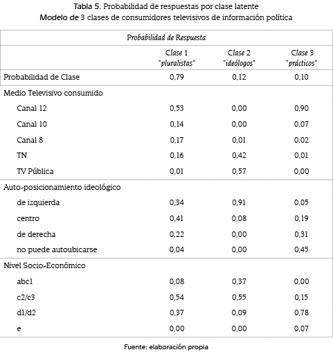 Para estimar la presencia de clases latentes en el consumo de televisión de la muestra, se aplicó el ACL sobre un 56,20 % de encuestados que manifestaron informarse habitualmente sobre política por este medio, en el marco de cinco alternativas que recibieron el mayor número de menciones: las señales abiertas locales de Canal 12, Canal 10, Canal 8 y las señales nacionales prepagas (por sistema de cable o satelital) TN y TV Pública. Comparativamente, el modelo de 3 clases registró el mejor ajuste y parsimonia, logrando explicar un total de 208 casos (93,69 % de efectividad).