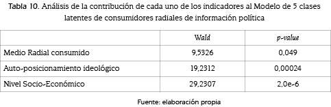 Sobre un 40,80 % de la muestra cuyo consumo radial se distribuyó entre cinco alternativas preferidas (Cadena 3, Mitre Córdoba, Radio Nacional, otras radios y FM), se procedió al ACL estimando, como se hizo anteriormente, modelos de 1 a 6 clases. Como se advierte en la tabla 9, a diferencia del consumo televisivo y gráfico, aquí resultó adecuado el modelo de 4 clases. Registrando valores mínimos en los dos indicadores de ajuste priorizados (AIC = 994,44 y AIC3 = 1016,44) y un error de clasificación aceptable (11 %), dicho modelo fue exitoso en la predicción de 143 casos (88,81 % de efectividad).