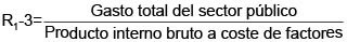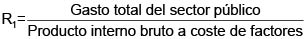 El indicador usualmente empleado para medir el tamaño del sector público es la proporción que representa el gasto público total respecto del producto interno bruto o el producto nacional bruto. La anterior razón puede considerar el denominador tanto a precios de mercado como a coste de factores. Ello hace que resulte la siguiente familia de indicadores.