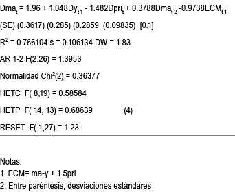 La ecuación 4 reúne adicionalmente una serie de propiedades interesantes desde el punto de vista económico. Si bien la ecuación 4 es un modelo dinámico y como tal describe el comportamiento de corto plazo de las importaciones, incluye como un caso especial la solución de largo plazo, lo cual resulta de las características de los modelos de corrección de errores, En efecto, suponiendo que las variables so i estables en sus niveles, esto es suponiendo que Dpri=Dy=0. resulta la ecuación de largo plazo que liga las importaciones (ma) a los precios relativos (pri) y al producto (y). Por tanto, a pesar de modelar la dinámica de las importaciones, ninguna información de largo pla/o se ha descartado, lo cual es sumamente importante toda vez que esta información es generada por la teoría económica. Esta solución de largo plazo es la ecuación 2, reproducida aquí para facilitarla lectura.