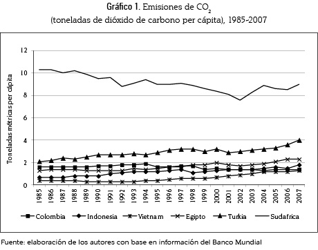 En los gráficos 1 y 2 se evidencia que Sudáfrica es el país que tiene más emisiones de CO2 y consumo de energía per cápita, en comparación con los demás países CIVETS. En el caso colombiano se observa que su comportamiento está dentro del rango de los demás países del grupo, y por ejemplo, Indonesia es el país con más crecimiento del grupo y una participación porcentual en emisiones de CO2 de un 4,8 %. Egipto e Indonesia son los países más homogéneos con una participación baja en emisiones de CO2 por persona.