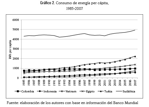 El consumo de energía de los CIVETS se ve reflejado en el gráfico 2 donde sobresale el consumo de energía de Sudáfrica a diferencia de los otros países del grupo, los cuales presentan un comportamiento homogéneo, que puede ser a causa de los hábitos en el consumo, como por ejemplo el mínimo uso de combustibles fósiles o una alta tasa de crecimiento económico durante la última década.
