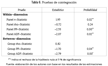 En la tabla 7 se observan los resultados de la estimación de la relación de largo plazo con base en la prueba de cointegración de Pedroni (1999, 2004), para la ecuación (1), y se observa que todos los coeficientes son estadísticamente significativos al 1 %, y, además, tienen el signo esperado a-priori.