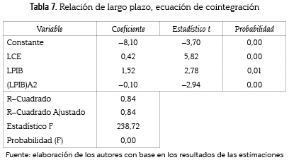 Lo anterior implica que el punto de inflexión se encuentra cuando el PIB alcanza un nivel de 7,99 en logaritmos (o 2.951,29 en millones de dólares del 2000 per cápita). Estos resultados refuerzan la hipótesis de la existencia de una CKA, ya que el nivel de emisiones de CO2 primero se incrementa con el PIB, después se estabiliza y finalmente decrece. La elasticidad del PIB sobre las emisiones de CO2 será mayor a 1, cuando el PIB per cápita es menor a 2,731 (en logaritmos). En resumen, en el largo plazo, las emisiones de CO2 son inelásticas al consumo de energía y elásticas al PIB si este es inferior a 2,73, mientras que inelástica si el PIB es mayor a 2,73.