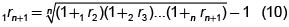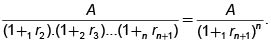 La expresión (3) muestra una relación uno a uno entre el precio de una unidad monetaria que se entregará dentro de un período y la tasa de interés para el mismo período. Podemos preguntarnos ¿Existirá una tasa equivalente para el precio de una unidad monetaria que se entregará dentro de n períodos? La respuesta es afirmativa. Ahora, para efectos de comparabilidad con las tasas de un período, esta tasa de n-períodos, 1rn+1 debe ser constante de tal manera que el efecto de las tasas de interés existentes durante los n períodos sea igual al efecto repetido, n veces, de esta nueva tasa. Así, para una cantidad cualquiera, dada, A, debe cumplirse que