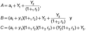 Las rectas AB, AC y BC están relacionadas con solo dos consumos (se sacrifica el consumo de un período invirtiendo la cantidad que podría estar destinada a ello). Las pendientes de estas rectas están dadas por m1 = – (1 + 1r2), m2 = ~(1 + 1r2) (1 + 2r3) y m3 = ~ (1 + 2r3), respectivamente.