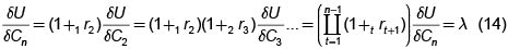 Esta relación tiene el mismo significado que la encontrada en el caso de dos períodos y es independiente de la estrategia o de las estrategias de inversión que se hayan utilizado durante todos los períodos en virtud de la posibilidad de descomposición de un contrato de varios períodos en una serie de contratos de un período.