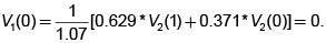 El significado del proceso estocástico de valor es claro: en t = 0, el valor del portafolio es la suma del valor de x bonos más el valor de y acciones (cada una vale el equivalente a s bonos); en t = 1 el valor de cada bono es (1+R) y el valor de cada acción es s1 que es una variable aleatoria. En t = 1 el valor del portafolio es uno de los elementos del siguiente conjunto {(1+R)x + y su, (1+R)x + ysd} que, junto con el estado inicial, forman el espacio de estados del proceso.