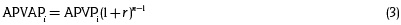 Donde APVAPi son años potenciales de vida perdidos ajustados al año i, APVPi es el número de años perdidos a los que se aplica el descuento para cada año del período de estudio, r es la tasa de descuento o actualización expresada en porcentaje. En este caso, r = 3%3, n son los años del período de estudio.