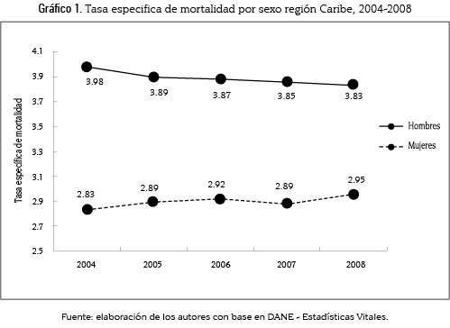 Por sexo (gráfico 1), el comportamiento de la tasa específica de mortalidad (TEM) en la región Caribe para el período 2004-2008 ha tendido a aumentar en las mujeres y a disminuir en los hombres. La tasa específica de mortalidad por sexo en las mujeres, creció cerca de 0,12 muertes por cada mil habitantes, mientras que en los hombres la TEM disminuyó en 0,15 defunciones por cada mil habitantes en el período 2004-2008. A pesar de que las defunciones, tanto de hombres como de mujeres, crecieron para el período de estudio, la intensidad con que lo hicieron fue distinta. Las defunciones en hombres crecieron a una tasa promedio para el período de 0,33 %, mientras que las defunciones en mujeres crecieron a una tasa promedio de 2,23 %.