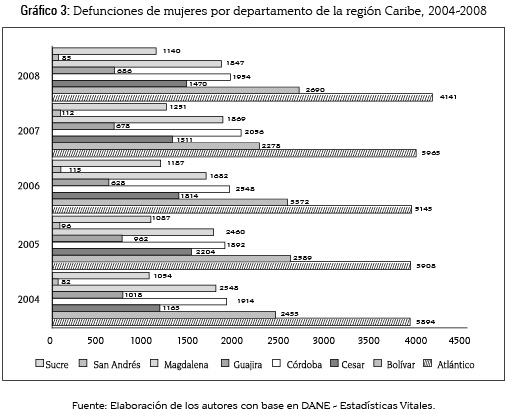 Las defunciones en hombres por departamento (gráfico 2) muestran una tendencia a decrecer en departamentos como Atlántico y La Guajira, una tendencia a aumentar en departamentos como Bolívar, Córdoba, Cesar y Magdalena, y una tendencia estable para el caso de San Andrés y Sucre. En Atlántico, Las defunciones de hombres disminuyeron alrededor de 4,6 % del año 2004 al año 2008, pasando de 5.046 defunciones en 2004 hasta 4.817 en 2008. Por otro lado, en lo que concierne a los departamentos con una trayectoria de crecimiento positiva, se destacan la conducta de Bolívar, Cesar y Córdoba, para las cuales los eventos de mortalidad masculina crecieron entre 2004 y 2008 en 8,42 %, 5,25 % y 5,82 %, respectivamente.