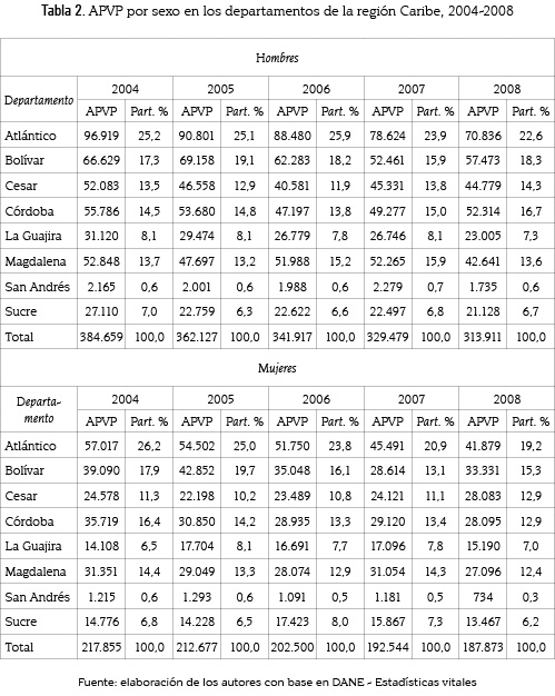 Por otra parte, para todos los años de estudio y en cada departamento del Caribe, el sexo masculino genera mayor número de APVP que el femenino, lo que indica una tendencia a la mortalidad temprana más marcada en hombres que en mujeres (tabla 2).