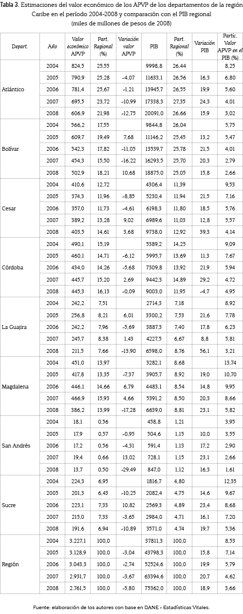 En lo que concierne a la valoración de los APVP en la región Caribe colombiana (tabla 3), las pérdidas originadas por la mortalidad evitable en todo el periodo 2004-2008 equivalen a 15,09 billones de pesos aproximadamente (a precios del 2008). El año 2004, es el año en el que más pérdidas se presentan en la esfera regional (3,23 billones de pesos), mientras que el 2008 es el de menos pérdidas (2,76 billones). El valor de los APVP en dólares para el período 2004-2008 fue de 8,474 millones de dólares y representa en promedio el 5,2 % del PIB en el ámbito regional. La tendencia que muestra el valor económico de los APVP en el periodo de estudio es decreciente.