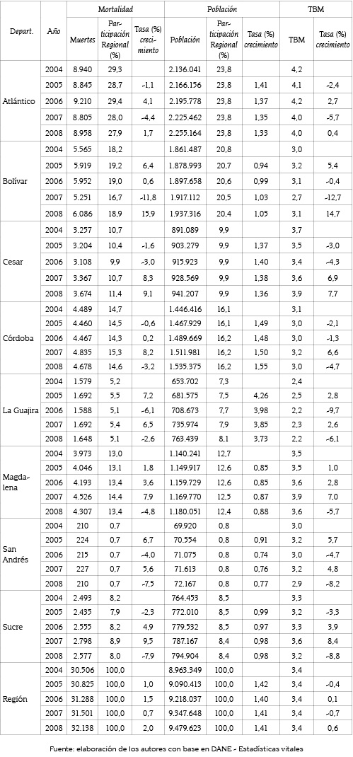 En el ámbito departamental, en la región Caribe, Atlántico, Bolívar, Córdoba y Magdalena aportan la mayor cantidad de defunciones. Otros, como San Andrés y La Guajira son los que registran la menor cantidad de defunciones. Atlántico, a pesar de ser el departamento con mayor participación dentro de las defunciones, mantuvo una senda de crecimiento casi invariable de 2004 a 2008; este fenómeno provocó un cambio en la estructura de mortalidad de la región, donde departamentos como Bolívar, Cesar y Magdalena cada vez ganan más participación.