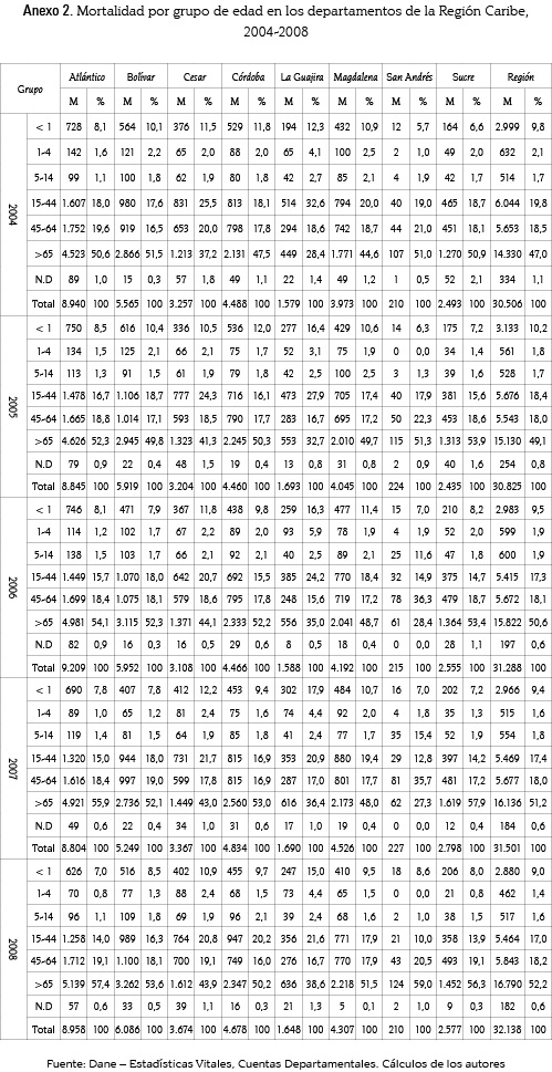 Para el caso de Colombia, la mortalidad es un fenómeno con una distribución geográfica desigual a lo largo de las regiones. La región Caribe es un ejemplo de esta situación. Según cálculos propios basados en los resultados del Censo General de 2005 suministrados por el DANE, la región Caribe2, representó cerca del 16 % de las defunciones no fetales totales en el país, cuando en términos de población agrupa a un poco más del 21 %, la región Andina, por su parte, representa el 56 % de la población, pero sus defunciones alcanzan el 60 % del total; asimismo, la Pacífica que agrupa el 20% de las defunciones del país, solo representa el 17% de la población del total. Esta situación, sumada a las características geográficas, culturales y socio-económicas de cada región, exige que la estimación del valor económico de las muertes sea evaluada de manera más desagregada, teniendo en cuenta departamento, sexo y causas agrupadas de defunción.